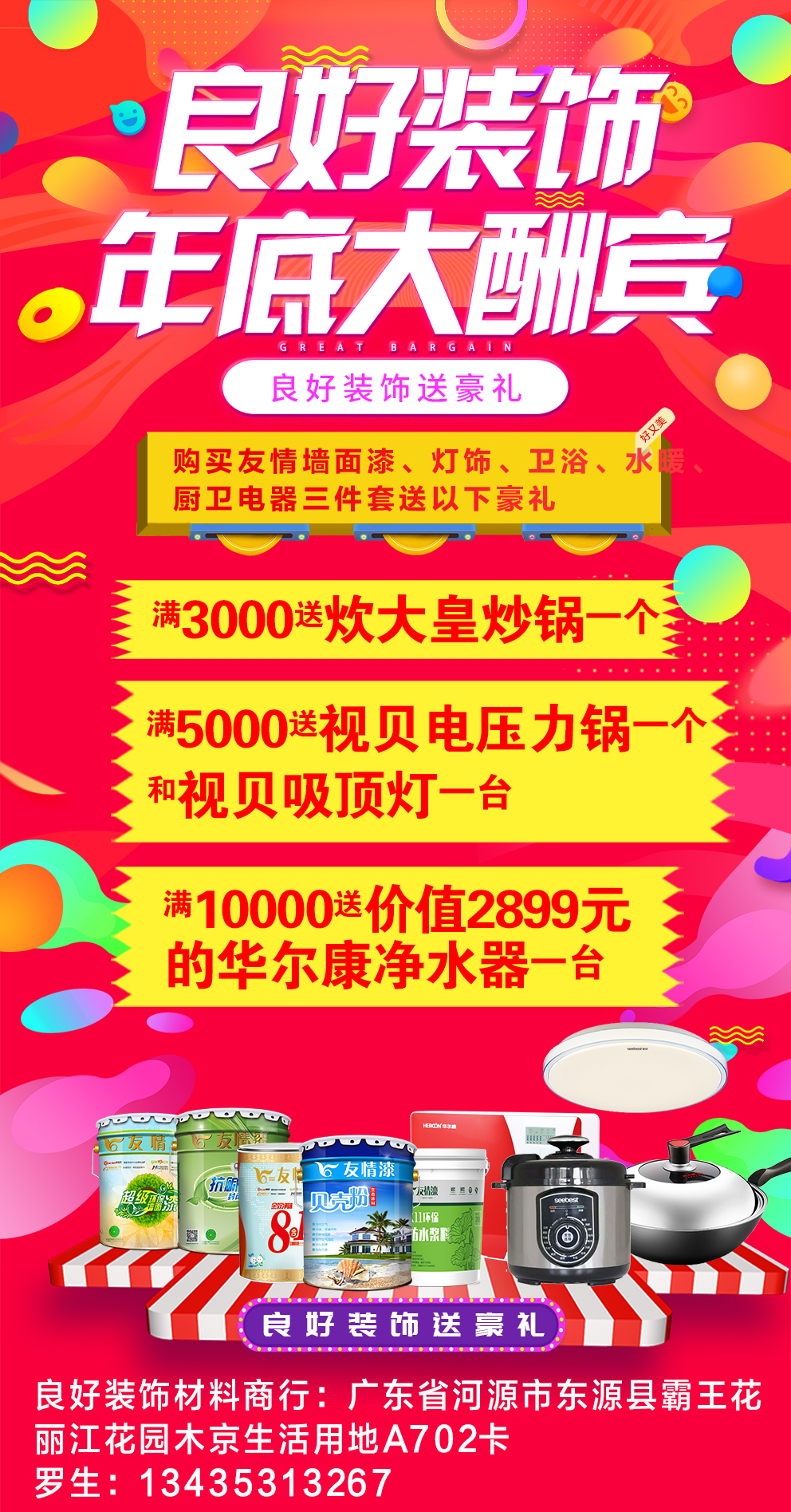 友情漆河源總代理良好裝飾行,在這一次的年底促銷活動中,一次性送出的高達2900價值的禮品。其中,消費滿3000元贈送名牌炒鍋一個,消費滿5000元贈送名牌壓力鍋一個和吸頂燈一盞,消費滿10000元贈送價值2900元的名牌凈水器一臺。